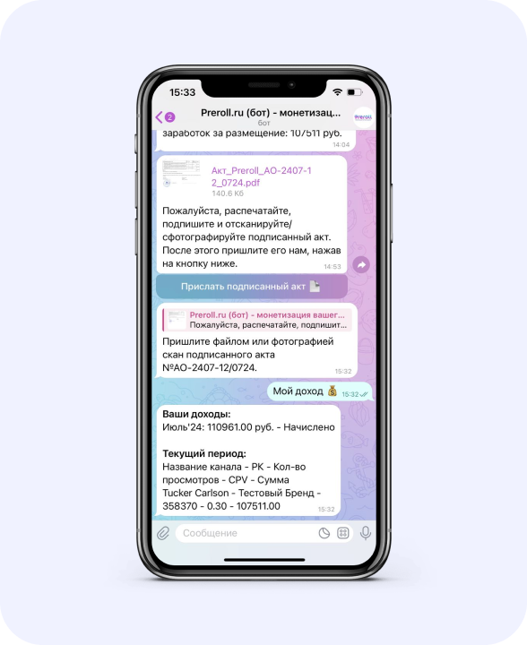 После завершения каждой рекламной кампании на вашем канале, вы будете получать отчет о заработанной сумме. Так же вы можете видеть все подлежащие оплате по завершению месяца суммы в телеграм-боте в разделе «Мой доход».
